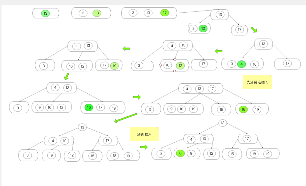 2. 循环找到B树要插入的叶节点(因为插入总发生在叶子节点)
