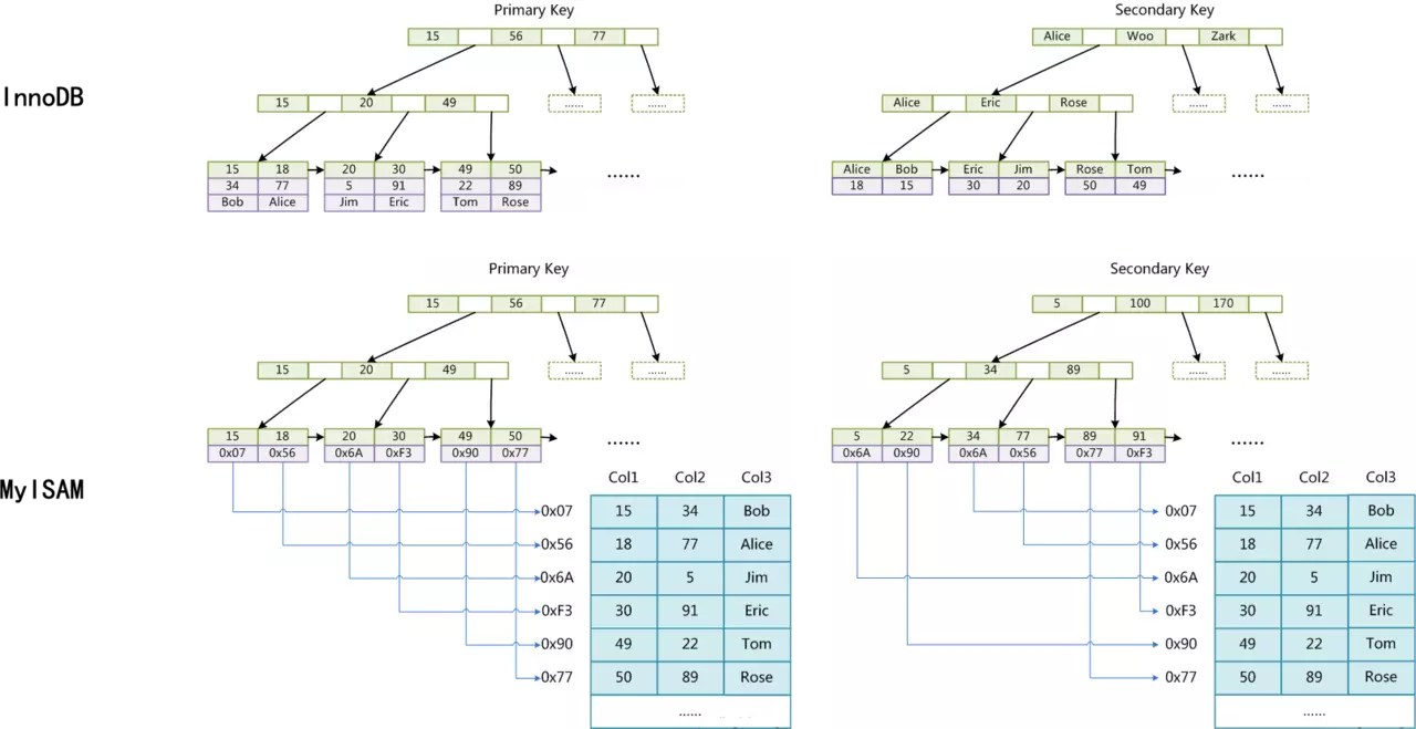 而 MyISAM 方式 B+ 树的叶结点只是存储了数据的地址,故称为非聚集索引。MyISAM 引擎使用 B+Tree 作为索引结构,叶节点的 data 域存放的是数据记录的地址;在 MyISAM 中,主索引和辅助索引(Secondary key)在结构上没有任何区别,只是主索引要求 key 是唯一的,而辅助索引的 key 可以重复。