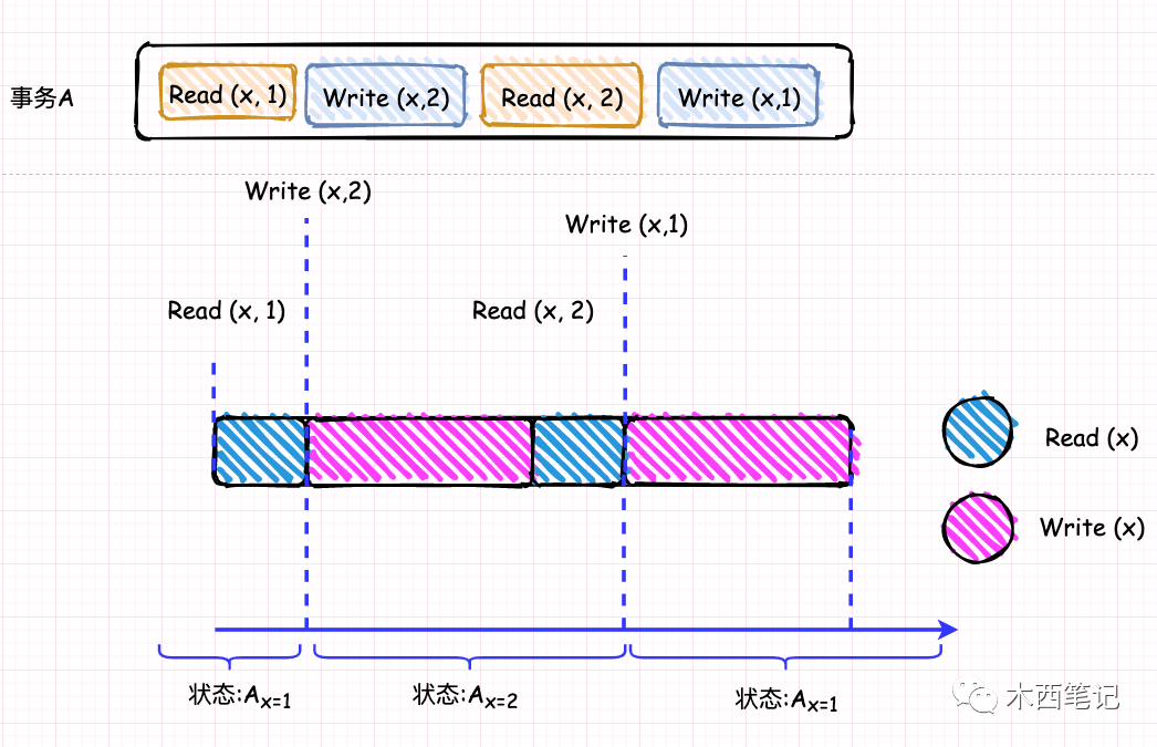 我们假设x的初始值是x = 1,事务A由(Read(x), Wirte(x, x =2), Read(x), Wirte(x, x =1) 的操作序列组成。那么对x的状态变化如下图: