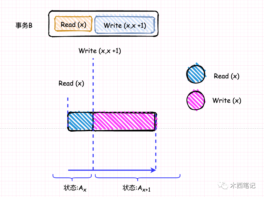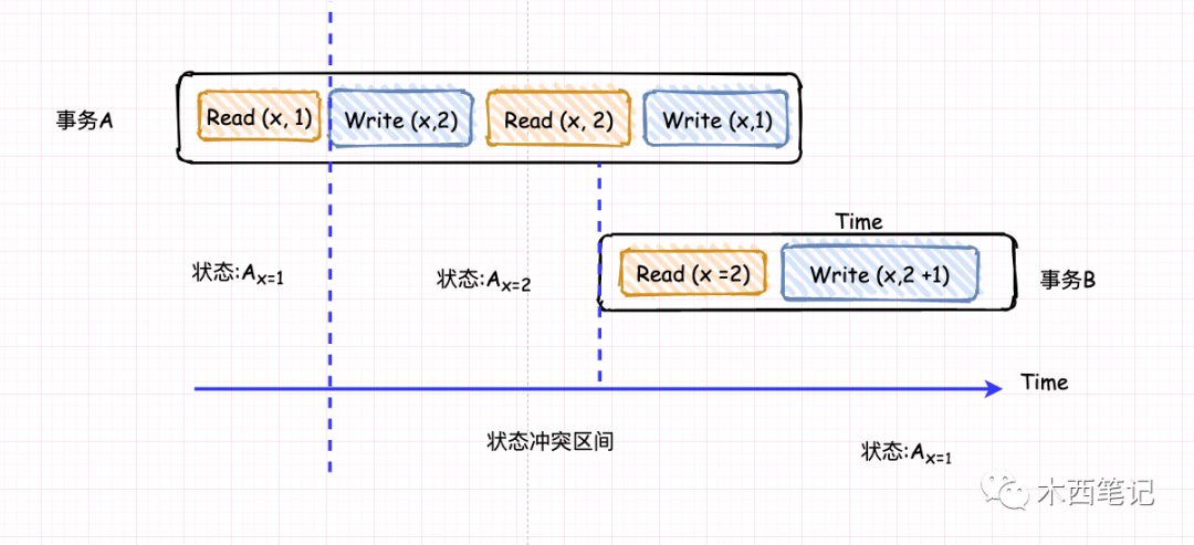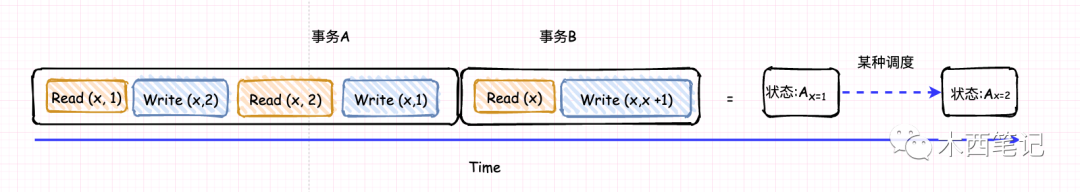 在上述隔离性(Isolation)的定义中,我们可以发现其目标是使并发事务的执行效果与串行一致。并从一致性(Consistency)定义中知道,事务是需要将数据状态从一个变成另一个状态。假设我们有数据x = 1,经过若干事务之后,我们需要让x = x’。