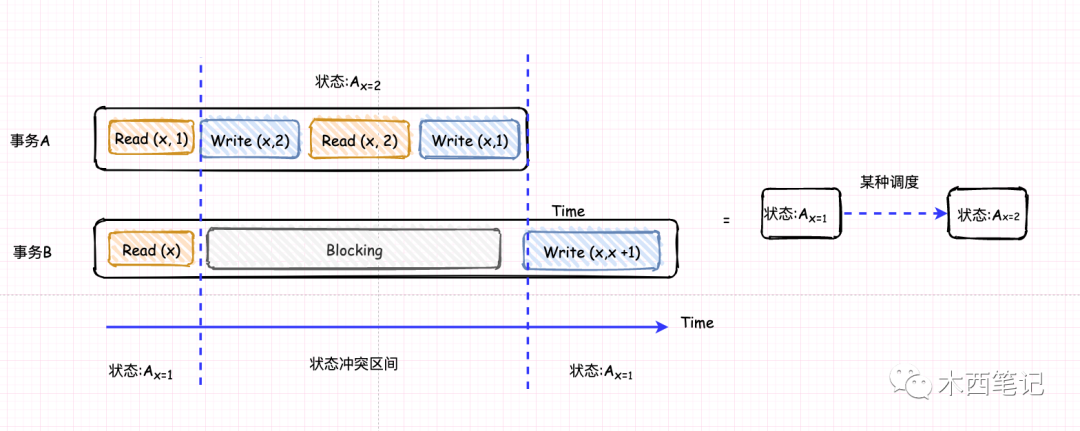因为事务B在串行执行的时候,第一个Read操作的起始状态为Ax=1,那么,我将这个操作提前到事务A相同的区间开始,事务B Wirte操作起始状态不满足的情况下阻塞等待。这样一来,我们就可以通过一个并行调度来降低事务A + 事务B的总执行时间。因此,我们称这个调度是可串行化调度。