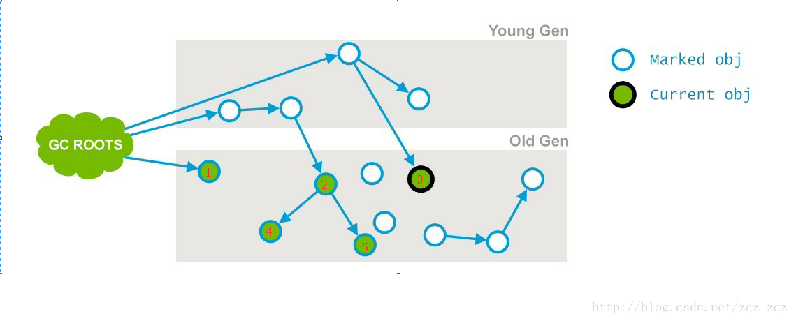 GC Roots对象,如下图节点1; - 标记年轻代中活着的对象引用到的老年代的对象(指的是年轻带中还存活的引用类型对象,引用指向老年代中的对象)如下图节点2、3;