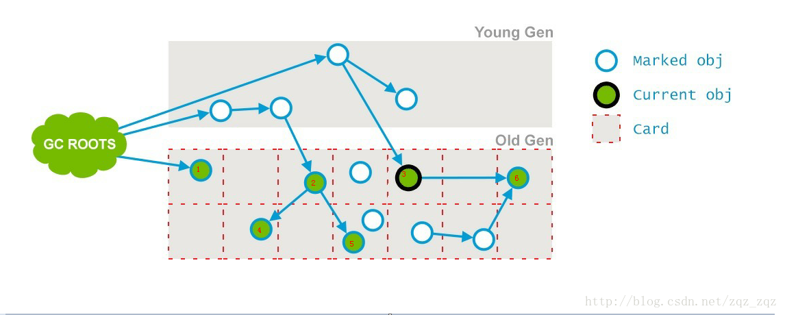 GC_ROOTS引用的,如上图的 current obj 这个对象,虽然在老年代,但是其引用还是在年轻带,并且在并发标记阶段,也有可能老年代的某些对象别重新被新生代的对象重新引用。所以在gc的时候不仅需要扫描老年代也需要扫描新生代确定GC_ROOTS。 -