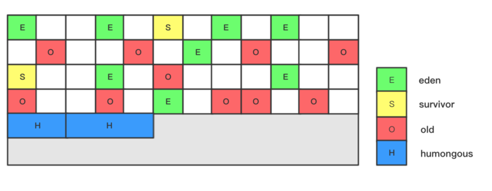 每个Region被标记了E、S、O和H,说明每个Region在运行时都充当了一种角色,其中H是以往算法中没有的,它代表Humongous,这表示这些Region存储的是巨型对象(humongous object,H-obj),当新建对象大小超过Region大小一半时,直接在新的一个或多个连续Region中分配,并标记为H。