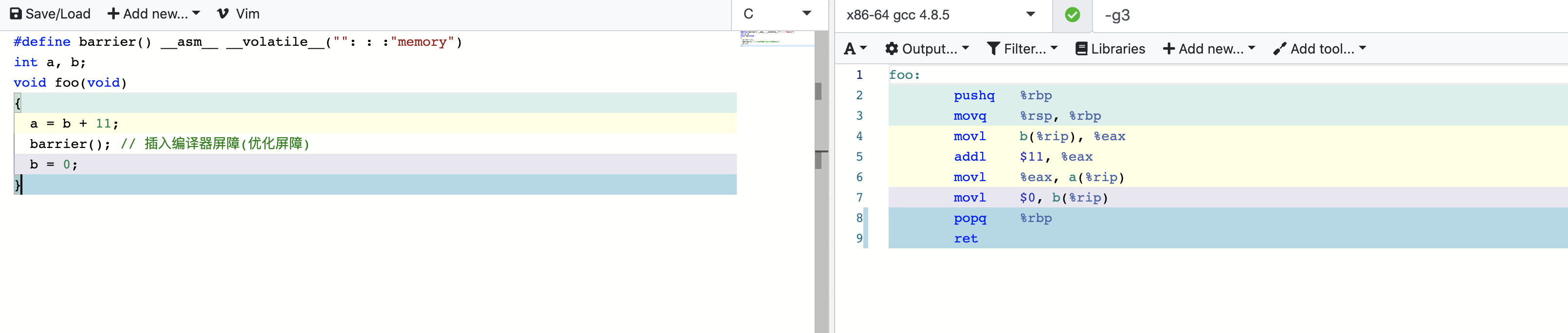 那么编译器屏障能解决这个问题吗?我们看之前的代码插入编译器屏障以后: