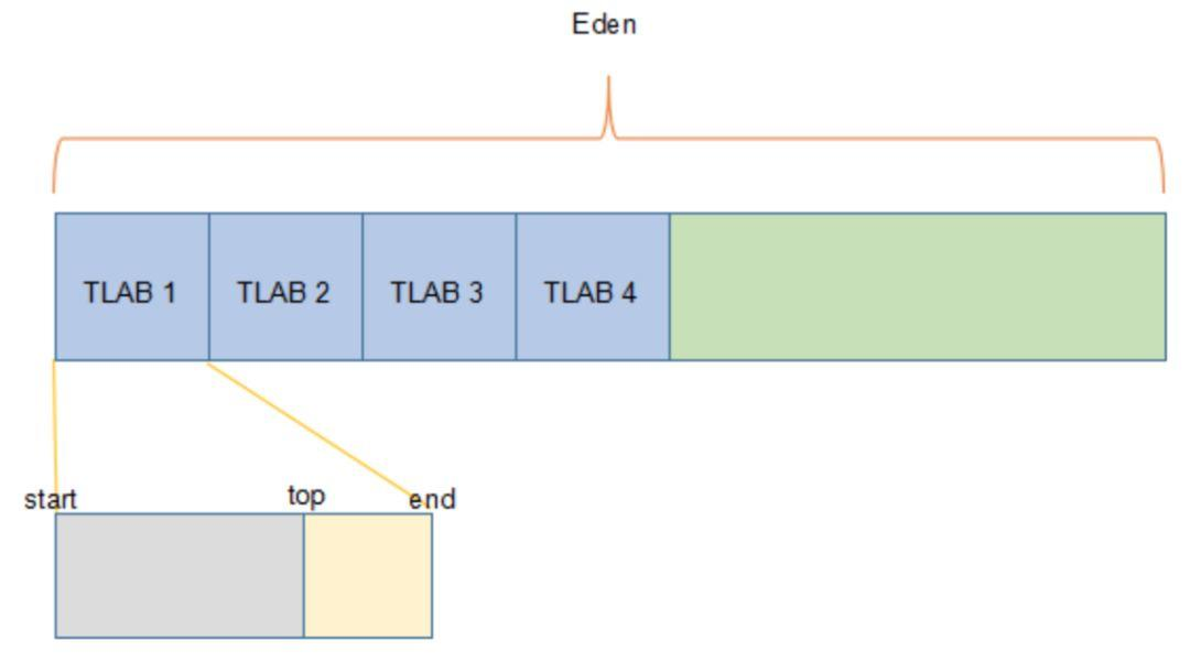 TLAB的管理是依靠三个指针:start、end、top。start与end标记了Eden中被该TLAB管理的区域,该区域不会被其他线程分配内存所使用,top是分配指针,开始时指向start的位置,随着内存分配的进行,慢慢向end靠近,当撞上end时触发TLAB refill。每次