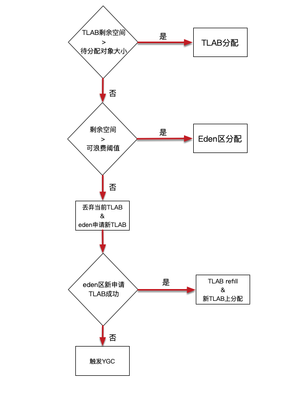 b. 从eden区裸空间重新分配一个新TLAB,然后对象再在新TLAB上分配。(这里从eden区新申请TLAB时,如果eden区空间不够,会触发YGC。)