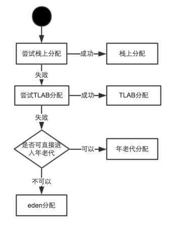 由以上整理可知,虚拟机对象分配流程大概如下:首先如果开启栈上分配,JVM会先进行栈上分配,如果没有开启栈上分配或则不符合条件的则会进行TLAB分配,如果TLAB分配不成功,再尝试在eden区分配,如果对象满足了直接进入老年代的条件,那就直接分配在老年代。在eden区和老年代分配主要通过“指针碰撞”和“空闲列表”两种方式实现,通过CAS解决堆上“非TLAB方式分配”的并发问题。