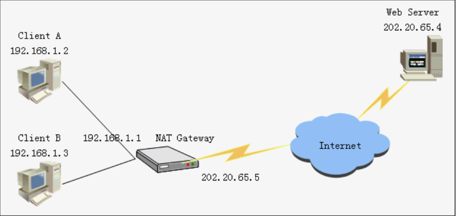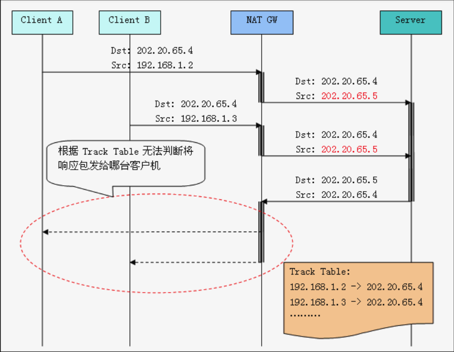 当仅有一台客户机访问服务器时,NAT Gateway只须更改数据包的源IP或目的IP即可正常通讯。但是如果Client A和Client B同时访问Web Server,那么当NAT Gateway收到响应包的时候,就无法判断将数据包转发给哪台客户机,如下图所示
