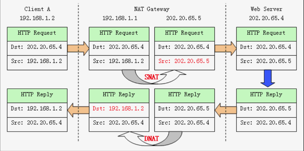 由于IP包的源IP已经被转换成NAT Gateway的公共IP,Web Server发出的响应IP包(Dst= 202.20.65.5,Src=202.20.65.4)将被发送到NAT Gateway。