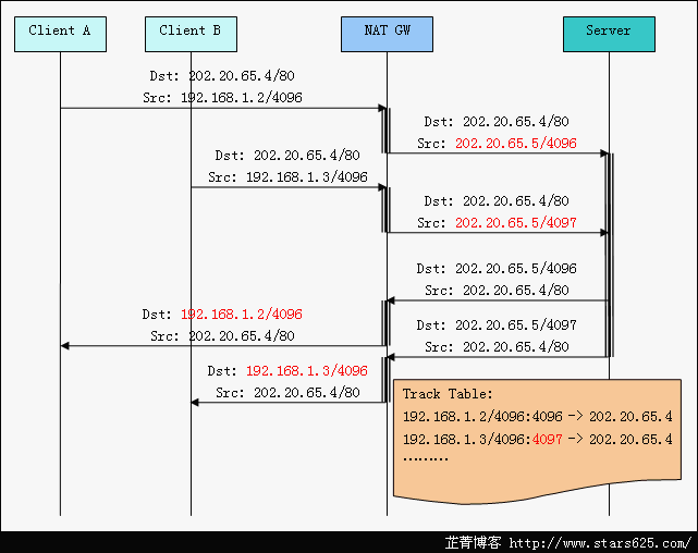 那么在Track Table里加入端口信息即可区分,如果源端口正好相同,那么在时行SNAT和DNAT的同时对源端口也要做相应的转换,如下图所示。