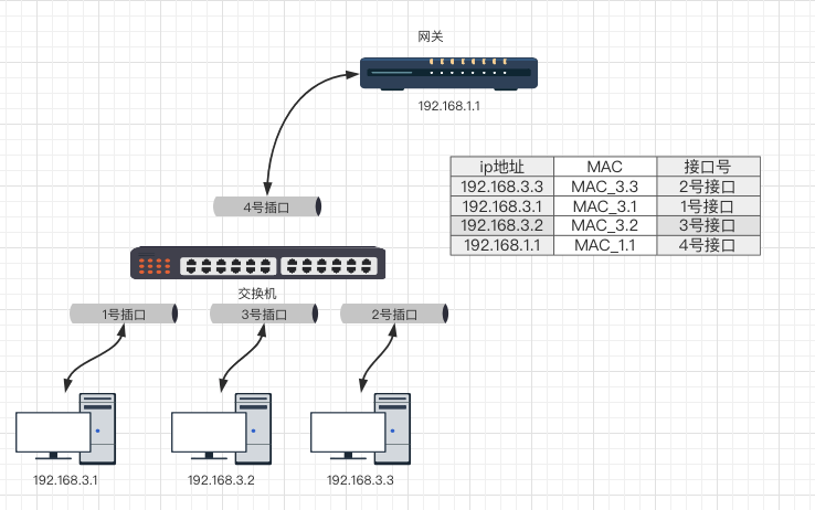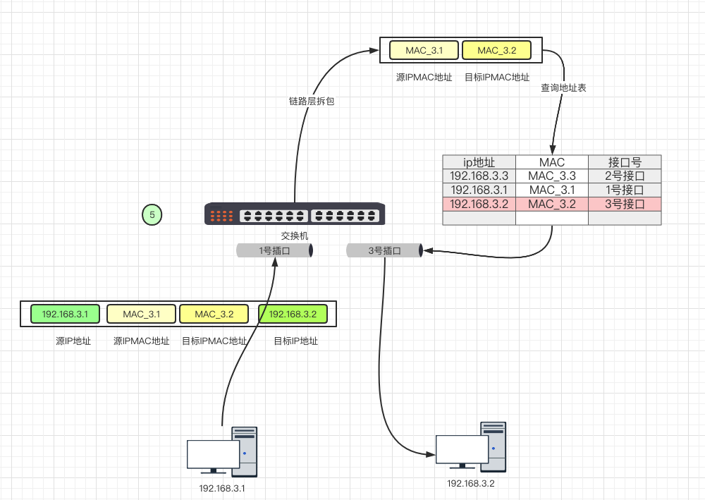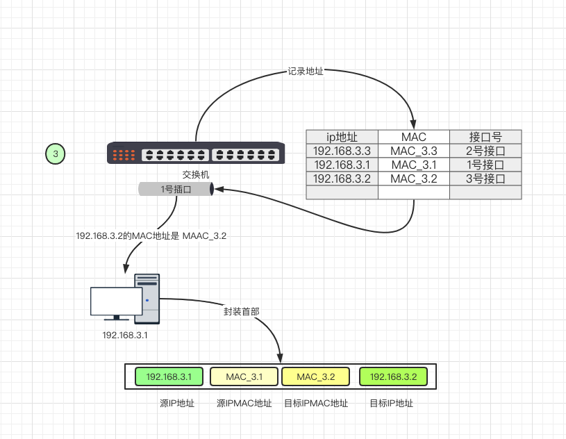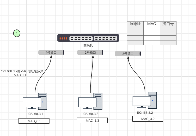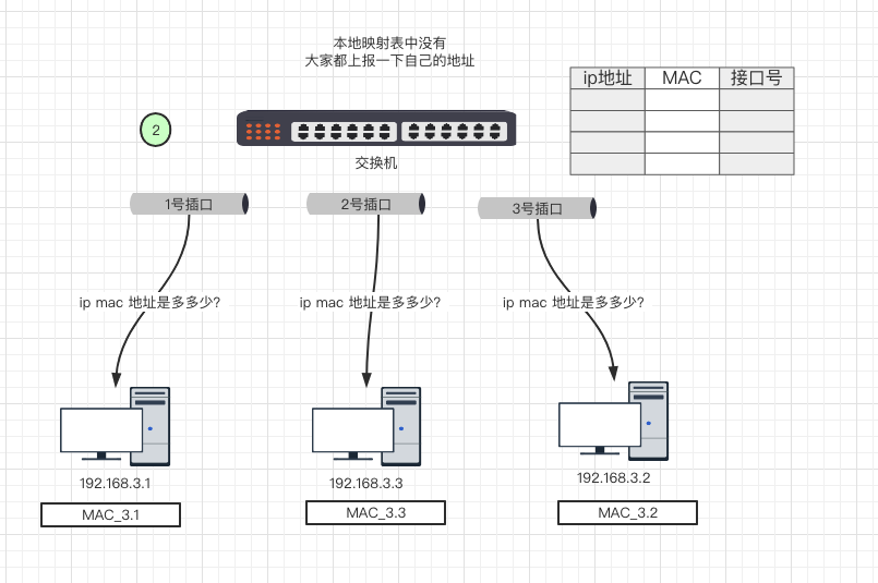 例如:192.168.3.1 要向 192.168.3.2 发送一个数据包,但是需要192.168.6.2 的MAC地址,那么他要想交换机询问