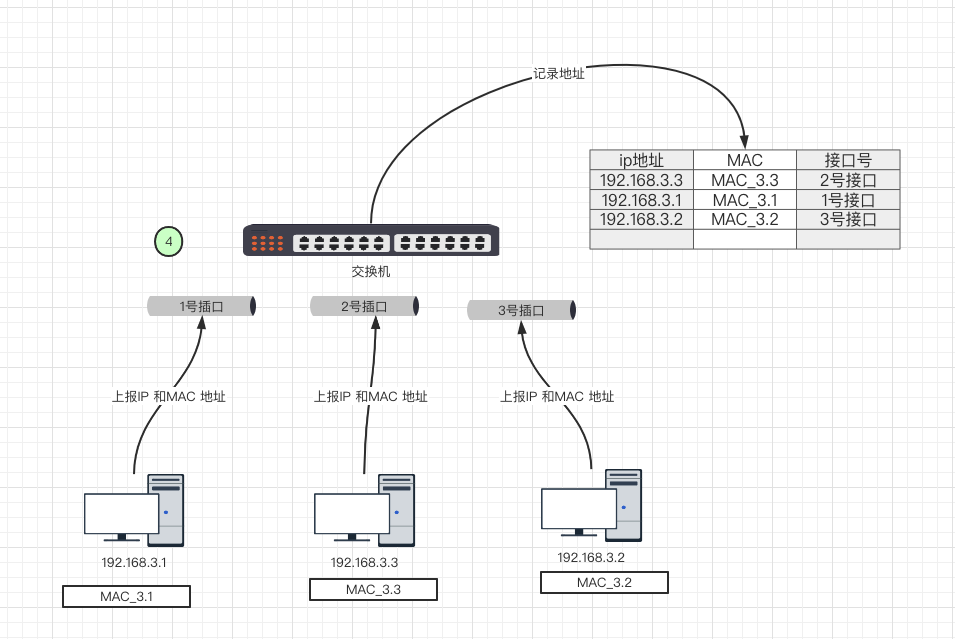 交换机发出广播,上报IPMAC地址并记录在案
