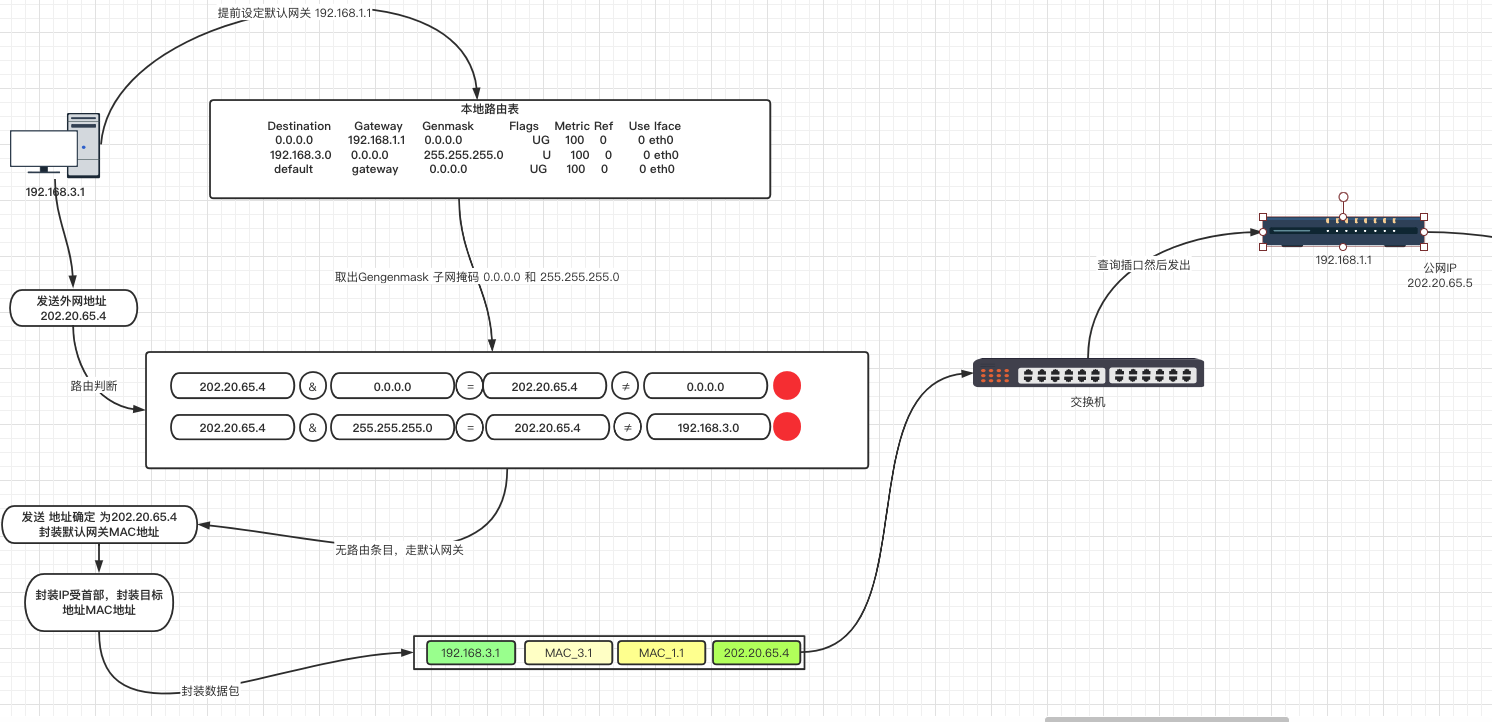 外网数据包在和本地路由匹配的时候,会发现没有匹配的路由条目,则要将数据发送到默认网关,由网关进行转发。流程如下图: