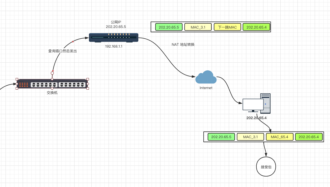NAT Gateway会将IP包的目的IP转换成私有网中主机的IP,然后将IP包(Des=192.168.1.2,Src=202.20.65.4)转发到私有网。对于通信双方而言,这种地址的转换过程是完全透明的。转换示意图如下。