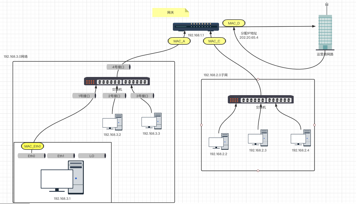 当一个数据包要发往外网的时候,需要将包发向自己的网关,再由网关进行NAT的地址转换。但是如果是要想内网发送数据包,在有三层交换机的前提下,是不需要走网关的。一般的网路拓扑结构为网关(网关是个更为抽象的概念,可以由路由器担任,也可以由主机担任。),网关链接运营商,运营商分配公网地址,网关向内提供私有地址。