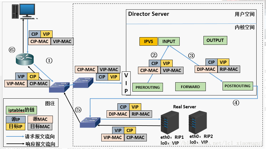 - ①、当用户请求到达Director Server,此时请求的数据报文会先到内核空间的PREROUTING链。此时报文的源IP为CIP,目标IP为VIP。