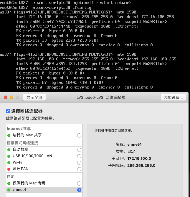 - 并配置lvs-node-1 和 lvs-node-2 的网关为 172.16.100.2 然后重启我们的网卡。