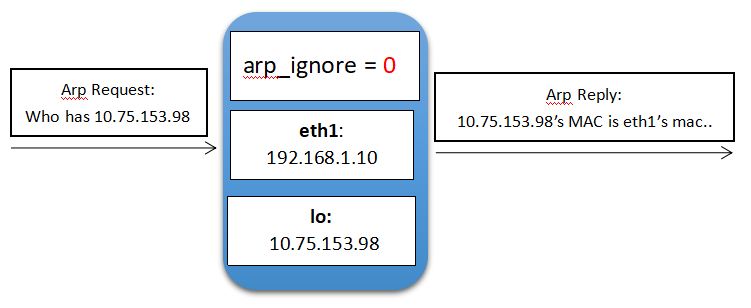 (1)当arp_ignore参数配置为0时,eth1网卡上收到目的IP为环回网卡IP的arp请求,但是eth1也会返回arp响应,把自己的mac地址告诉对端。 如下图