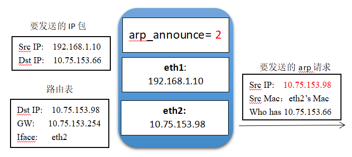 - (1) 当arp_announce参数配置为0时,系统要发送的IP包源地址为eth1的地址,IP包目的地址根据路由表查询判断需要从eth2网卡发出,这时会先从eth2网卡发起一个arp请求,用于获取目的IP地址的MAC地址。该arp请求的源MAC自然是eth2网卡的MAC地址,但是源IP地址会选择eth1网卡的地址。