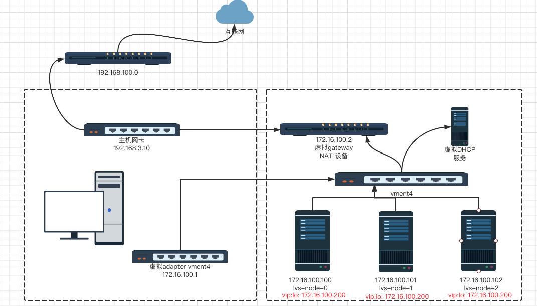 根据LVS四层负载均衡器所述,本节来详细搭建一下LVS环境, 这里我们只做NAT模型和DR模型。