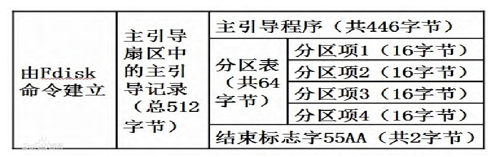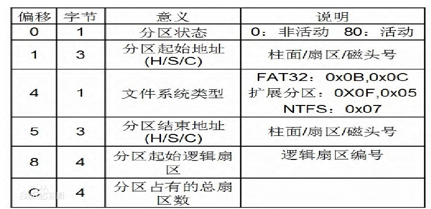 - 随后的64字节(偏移1BEH~1FDH)为DPT(Disk Partition Table,硬盘分区表)