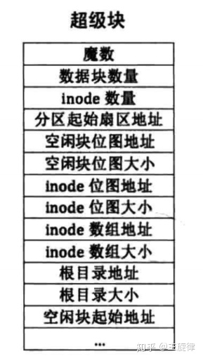 1)超级块(Super Block)描述整个分区的文件系统信息,如inode/block的大小、总量、使用量、剩余量,以及文件系统的格式与相关信息。超级块在每个块组的开头都有一份拷贝(第一个块组必须有,后面的块组可以没有)。
