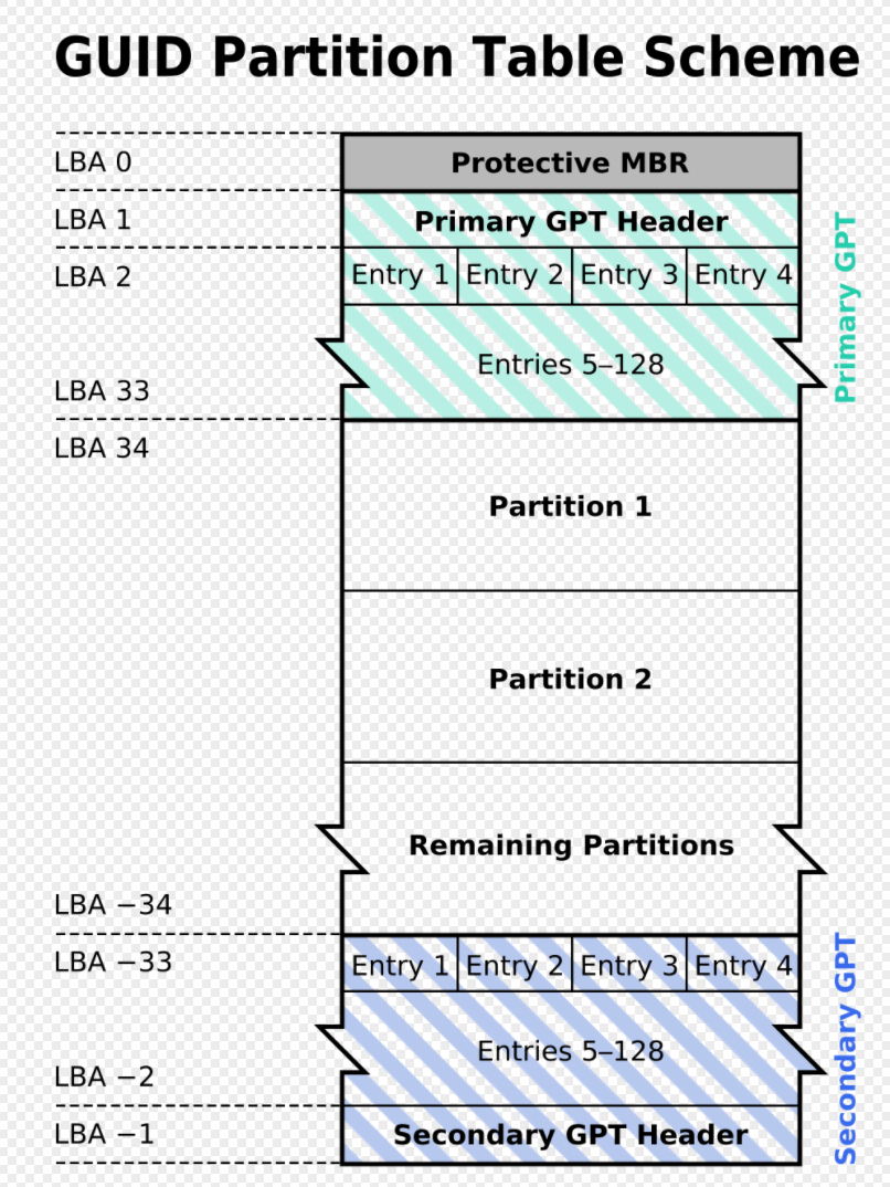 跟现代的MBR一样,GPT也使用逻辑区块地址(LBA)取代了早期的CHS寻址方式。传统MBR信息存储于LBA 0,GPT头存储于LBA 1,接下来才是分区表本身。
