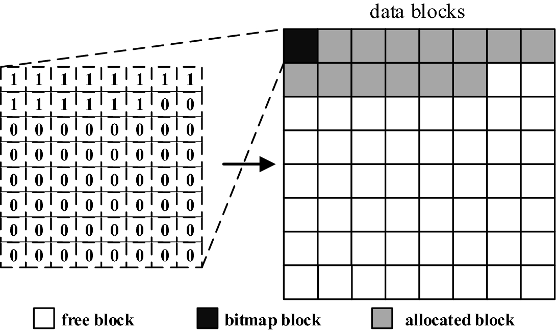 因为磁盘上的数据要和内存交互,而内存通常是以4KB为单位的,所以从逻辑上,把磁盘按照4KB划分比较方便(称为一个block)。现在假设由一个文件系统管理64个blocks的一个磁盘区域: