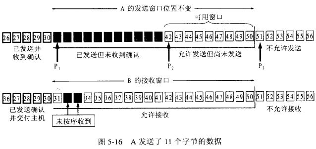 - A发送11个字节后,发送窗口位置不变,B接收到了乱序的数据分组: