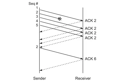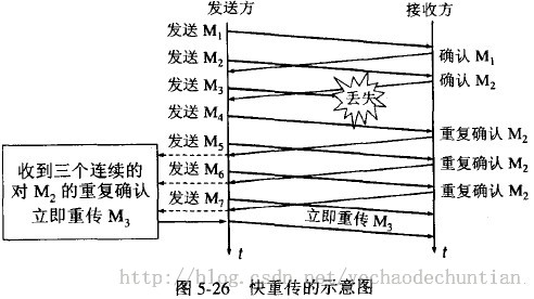 接收方收到了M1和M2后都分别发出了确认。现在假定接收方没有收到M3但接着收到了M4。显然,接收方不能确认M4,因为M4是收到的失序报文段。根据可靠传输原理,接收方可以什么都不做,也可以在适当时机发送一次对M2的确认。但按照快重传算法的规定,接收方应及时发送对M2的重复确认,这样做可以让发送方及早知道报文段M3没有到达接收方。发送方接着发送了M5和M6。接收方收到这两个报文后,也还要再次发出对M2的重复确认。这样,发送方共收到了接收方的四个对M2的确认,其中后三个都是重复确认。快重传算法还规定,发送方只要一连收到三个重复确认就应当立即重传对方尚未收到的报文段M3,而不必继续等待M3设置的重传计时器到期。由于发送方尽早重传未被确认的报文段,因此采用快重传后可以使整个网络吞吐量提高约20%