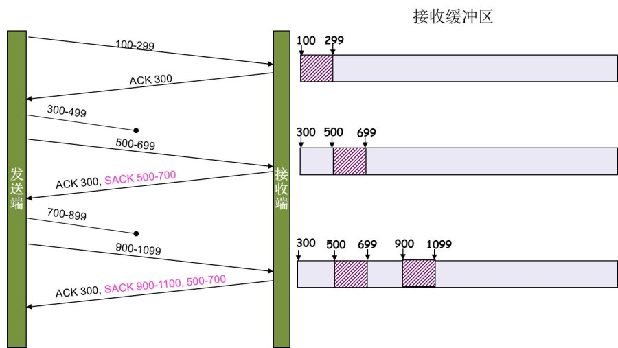 另外一种更好的方式叫:Selective Acknowledgment (SACK)(参看RFC 2018),这种方式需要在TCP头里加一个SACK的东西,ACK还是Fast Retransmit的ACK,SACK则是汇报收到的数据碎版。参看下图: